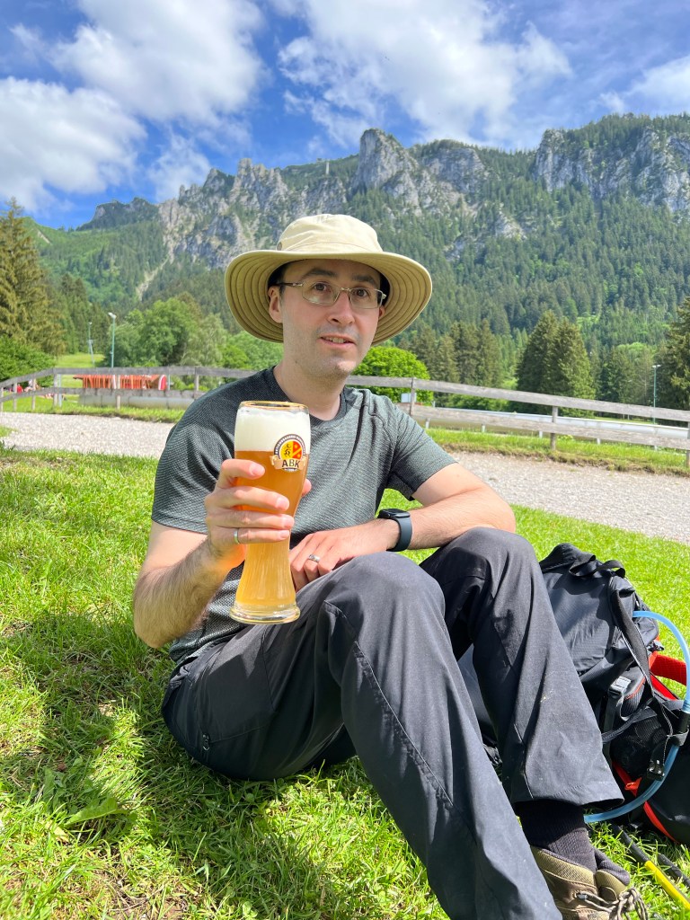 Returning to the top of the Tegelbergbahn, we grabbed a picnic table at the outdoor beer garden for a beer/pop and a snack. Then we made our way down the mountain- over 900 m of descent in 6.5 km.