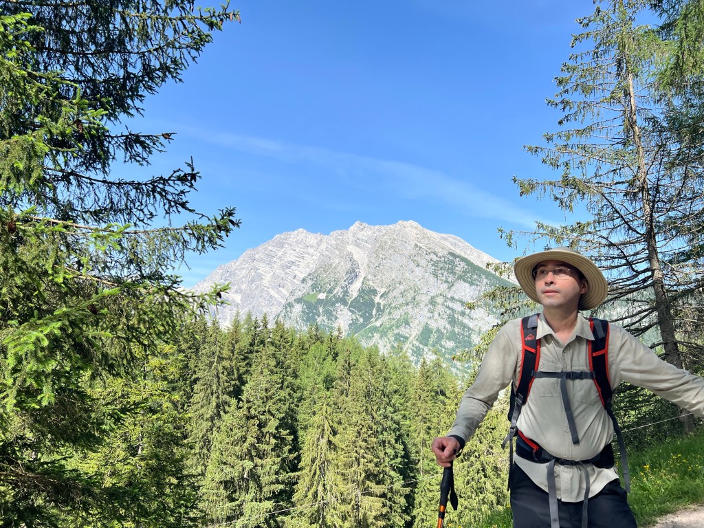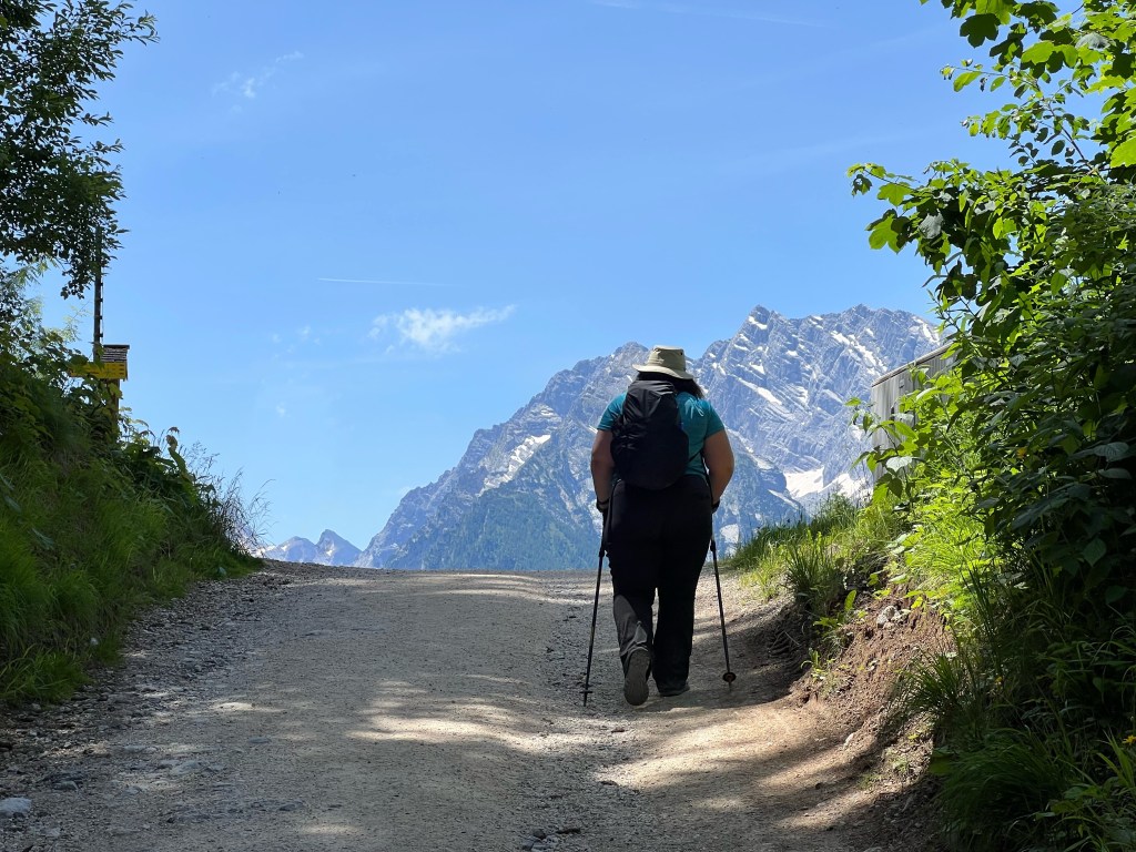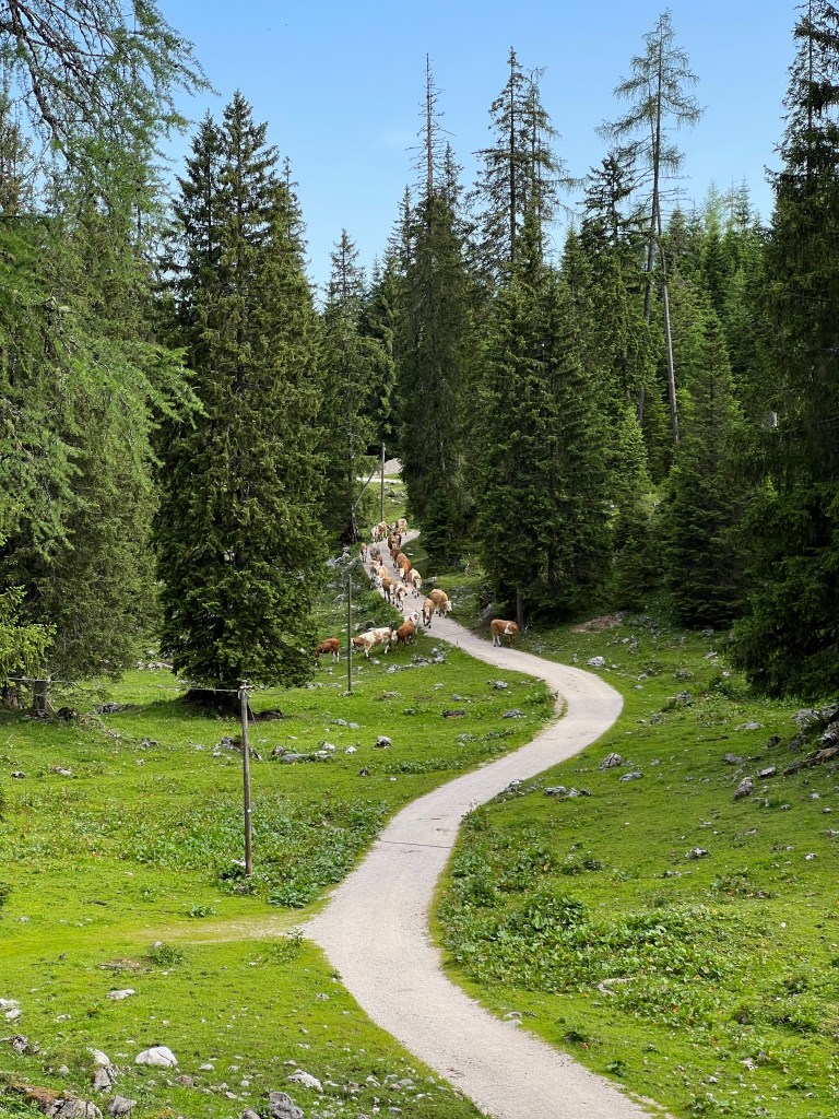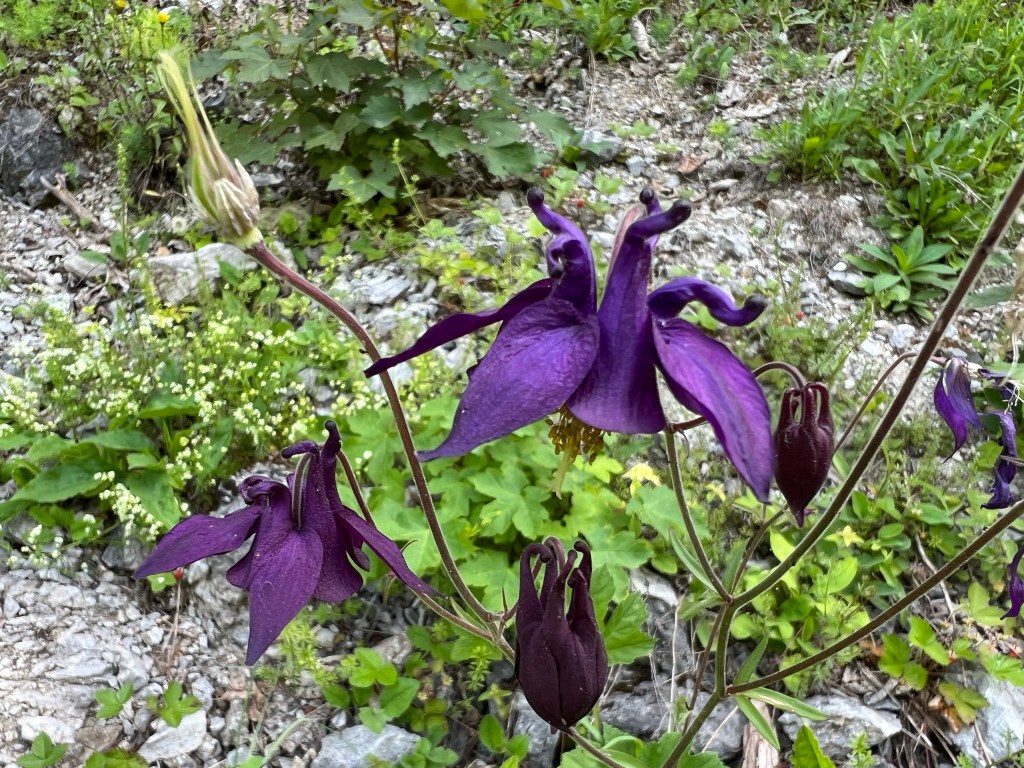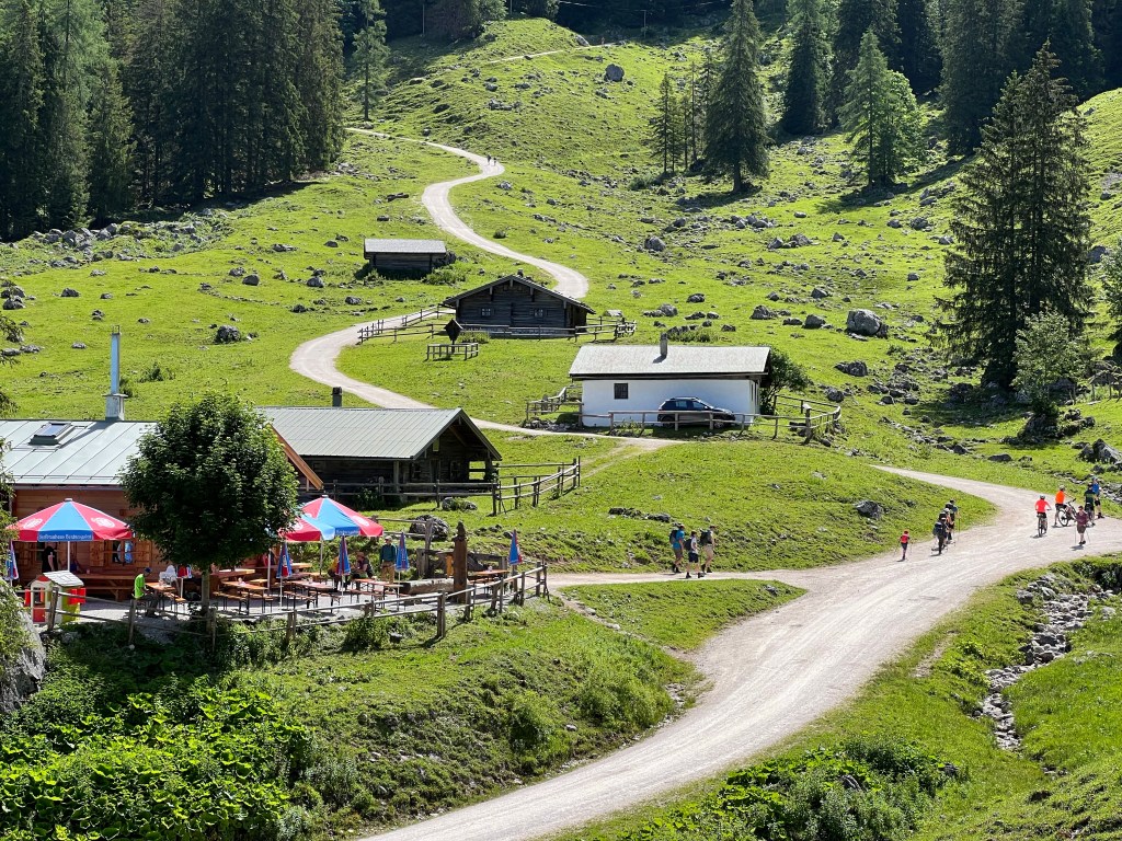 After eating we got our boots tied, packs on, and started back to the Jennerbahn middle station. Highlights included the antics of the cows, some new flowers, and a stop back at Königsbachalm. We took a different route from the alm to the Jennerbahn, which added some variety, including a small pond with many little fish.