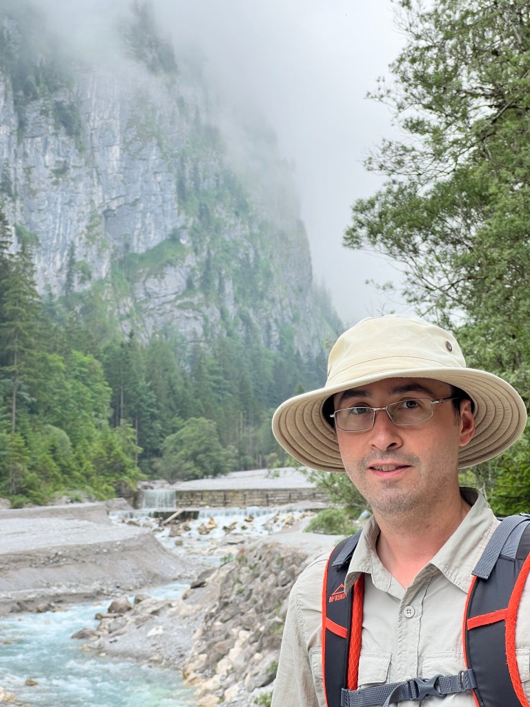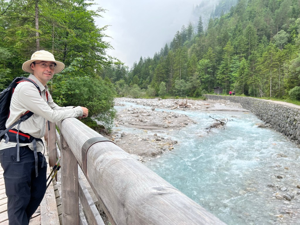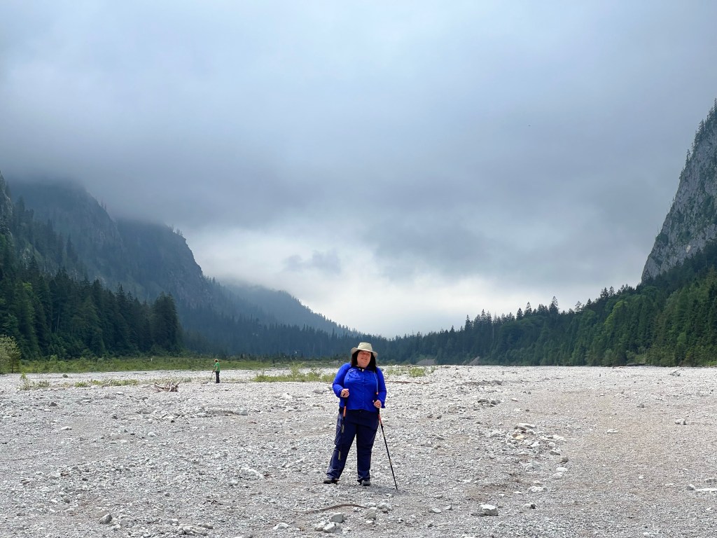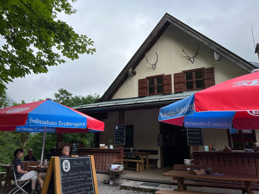 The day was warm but dreary, with clouds lying low in the mountains and rain in the forecast. A good day for low elevation hiking, so we travelled west towards Hintersee and got off the bus at the Wimbachweg trail. We had two objectives: explore the Wimbachklamm and enjoy our final hut refreshments at Wimbachschloss.