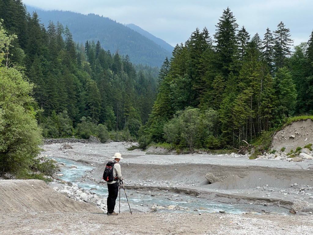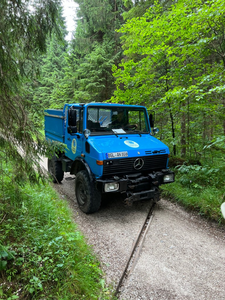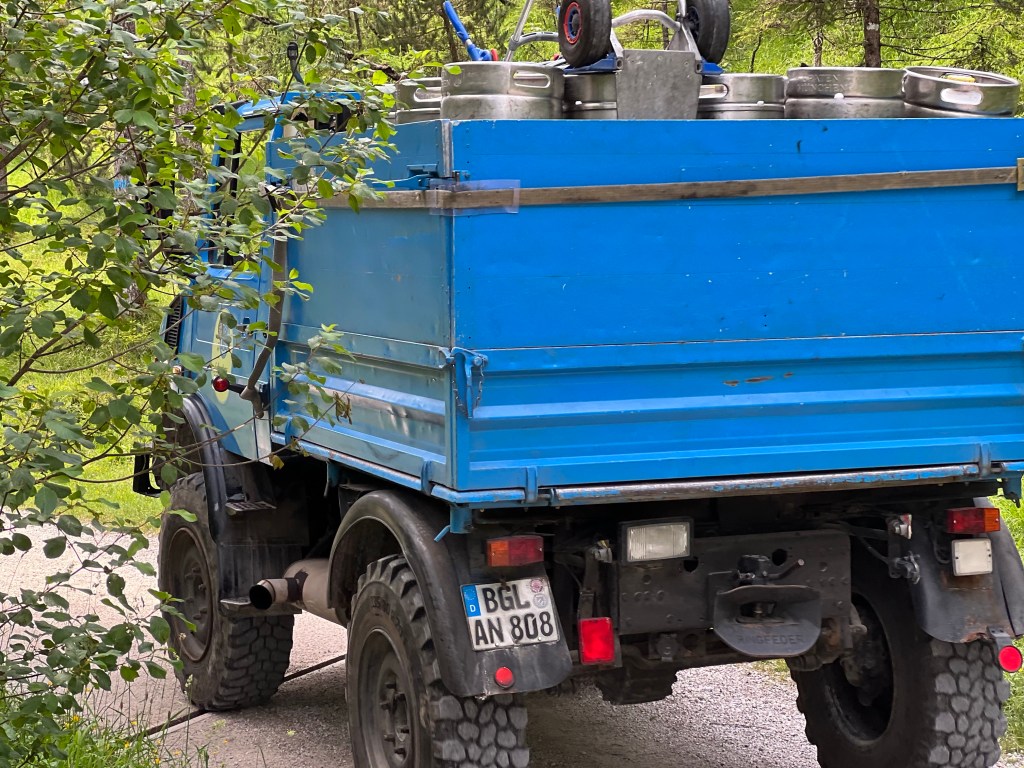 Climbing out of the gorge section, we then followed first the stream and then the alluvial fan in the valley behind Watzmann. It was a wide, gravel trail – and we learned both why it is so and how they get the beer to the huts, as a delivery vehicle went by.