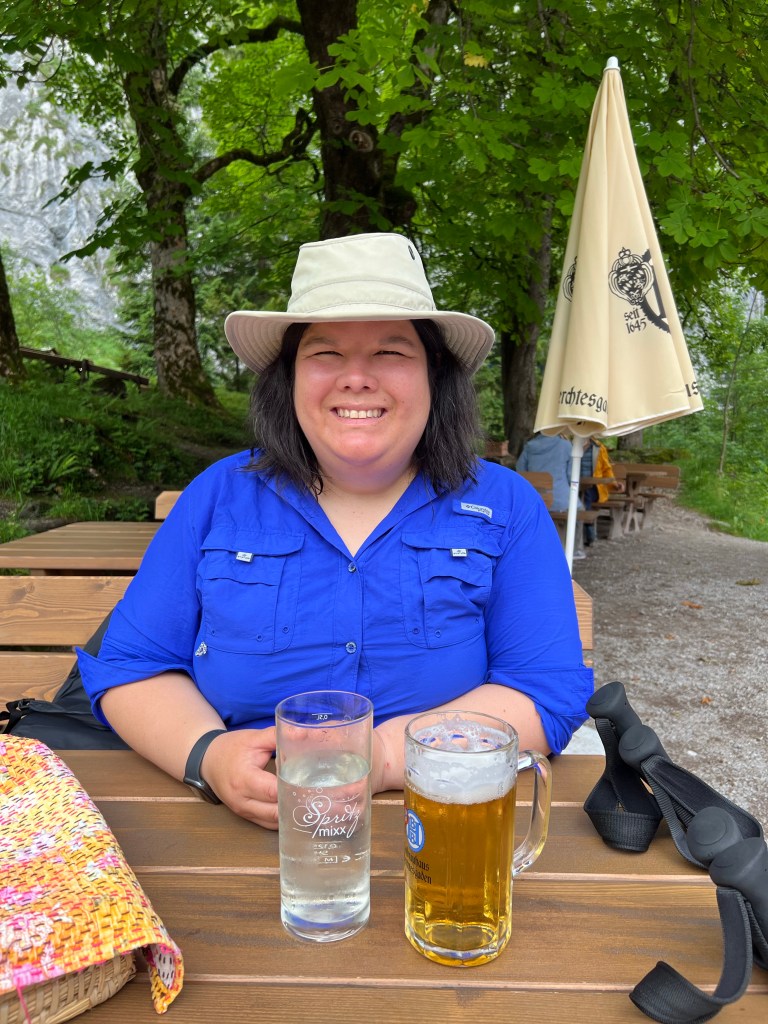 At the hut we enjoyed beer, a random non-alcoholic drink that was halfway between sparkling water and sprite, and topfenstrudel, which was a cheese curd / cheesecake type filling.