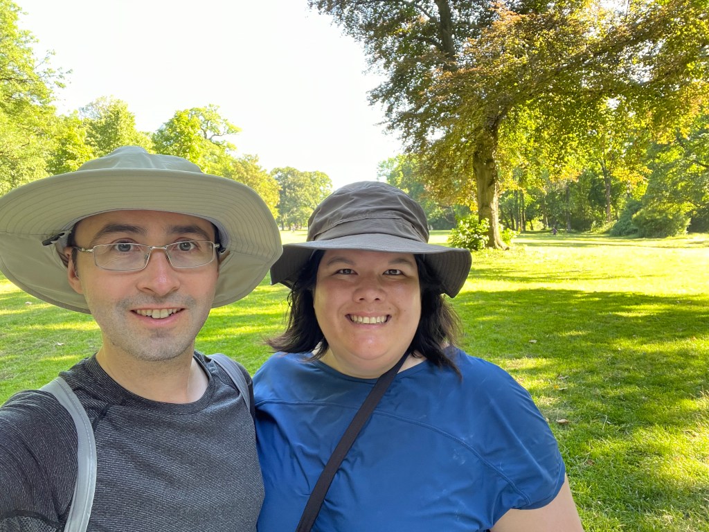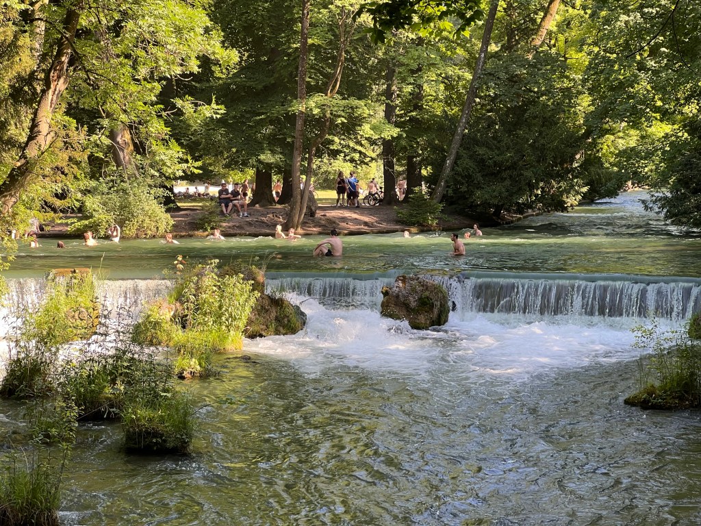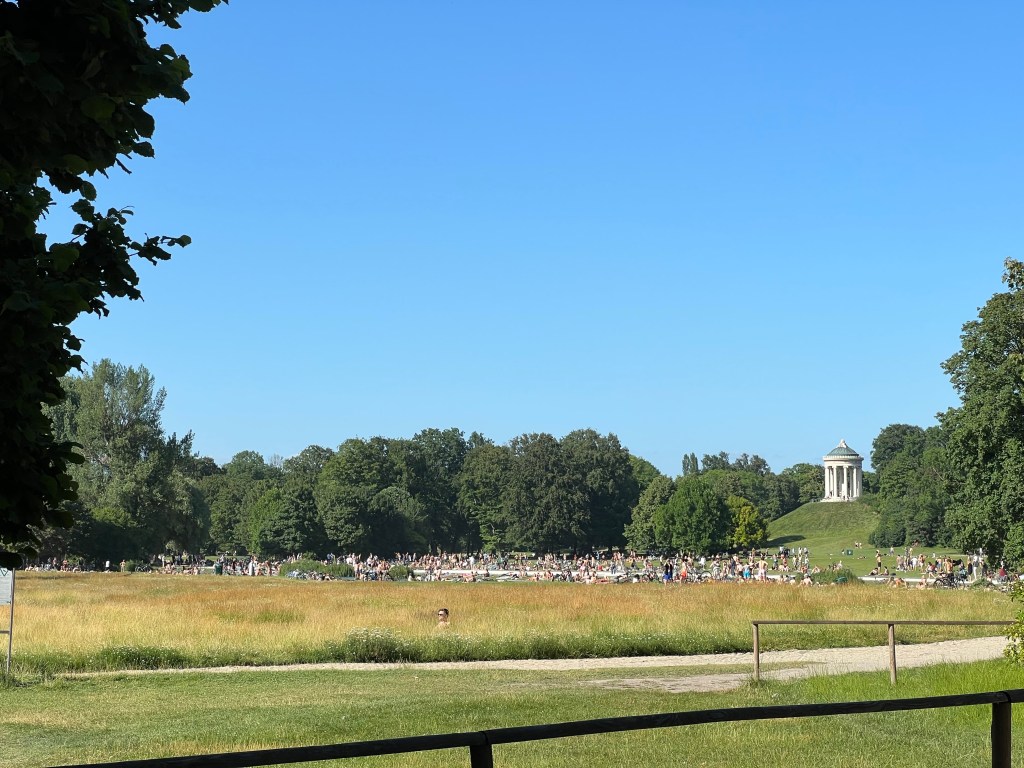 It was now late in the afternoon, so we stopped in at a bakery for delicious tomato and (fresh) mozzarella sandwiches and ice cold pop. Then we took a streetcar downtown, then wandered our way towards Englischer Garten. We even shopped en route, finding new sun “adventure hats” (Jen has been wearing her rain hat and Dave’s has seen better days). For those counting, it’s a hat trick!