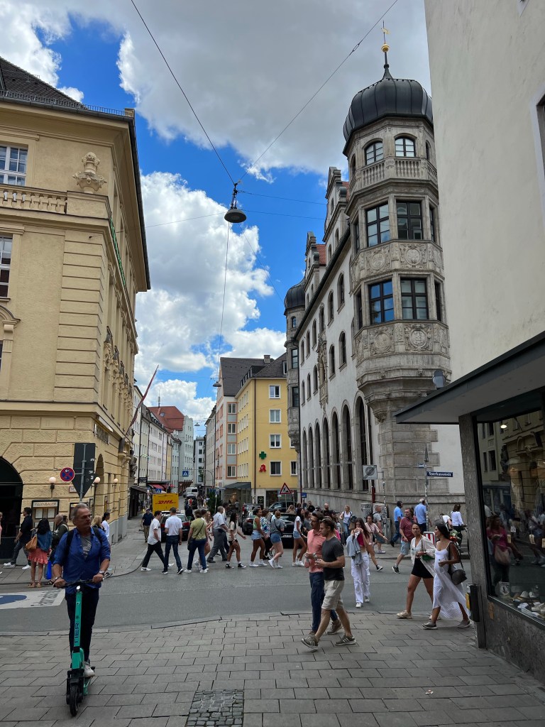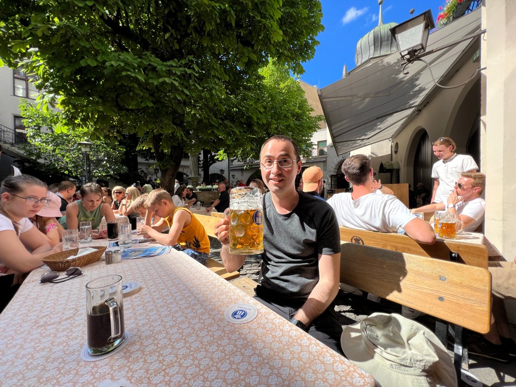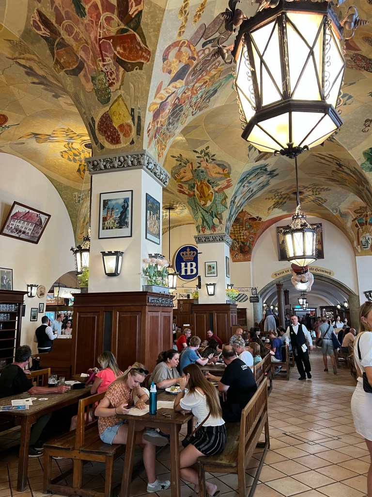 After completing a full museum day, we wandered downtown a bit before ending up at “the most famous tavern in the world,” the Hofbrauhaus. Dave had a litre of the Hofbrauhaus original with käsespatzel, and Jen enjoyed Weisswurst and a pretzel.