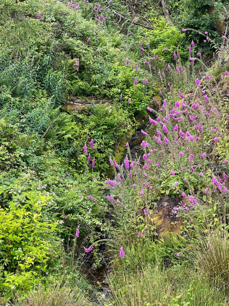 We eventually turn off onto a connector which skirts a clear cut, before joining a semi-active logging road. The flowers in the year after harvest were unreal. We also saw a Red Grouse. We received a bit of rain this section, but rain coats and wide-brimmed hats did their job.