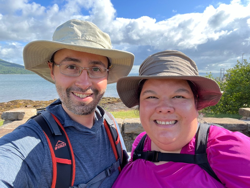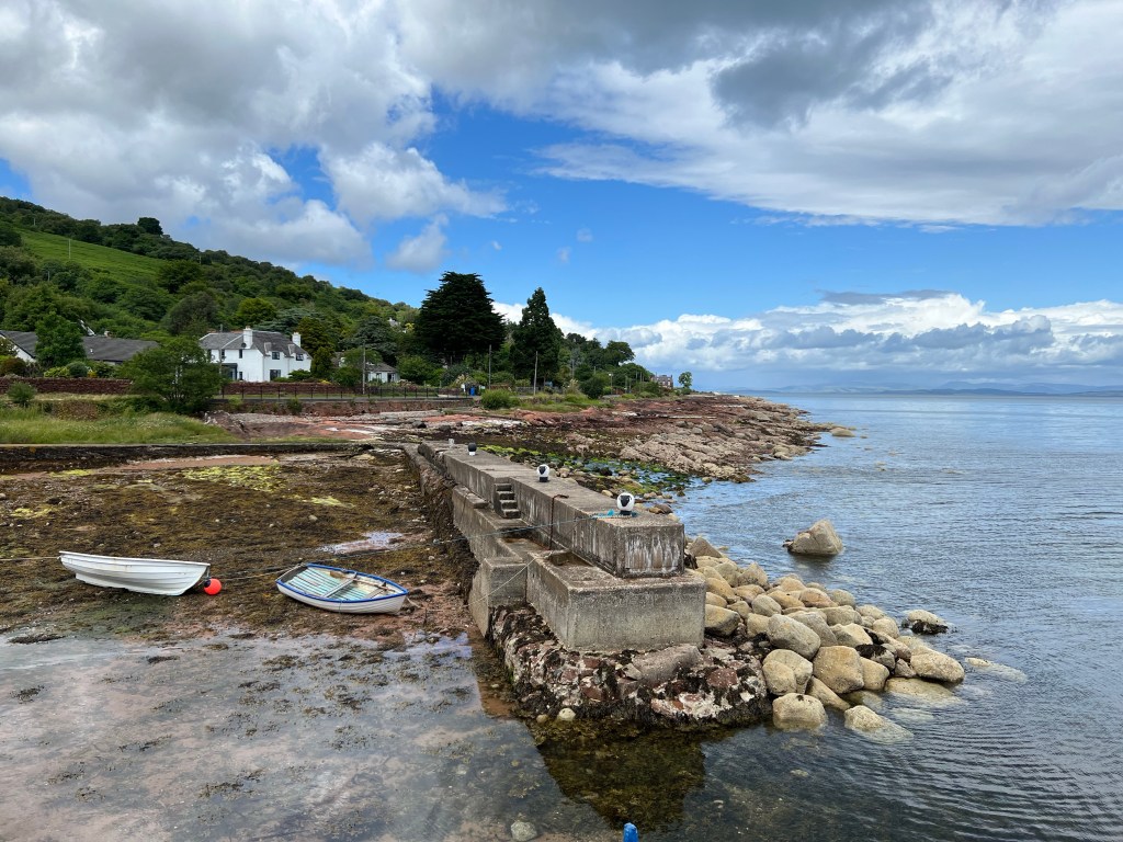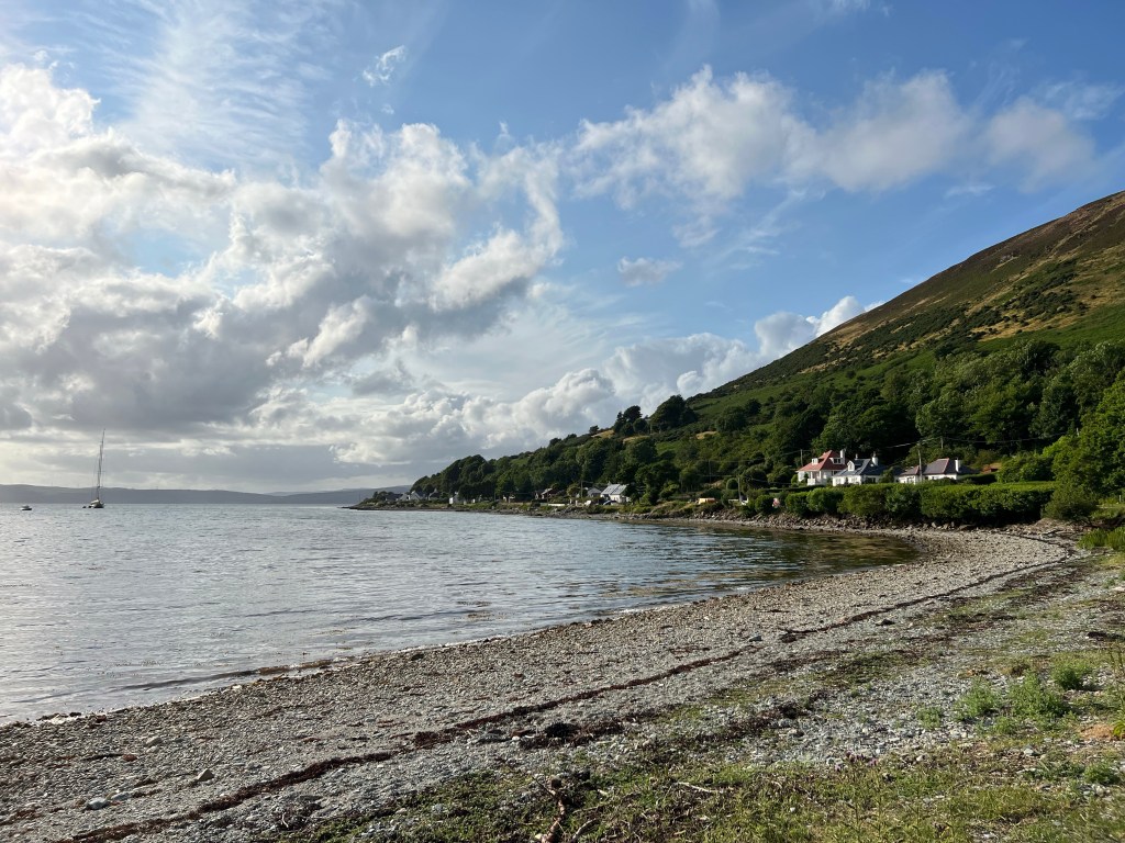 We turned down another trail, which eventually led us to the ocean-side road. We ate lunch along the water, watching oystercatchers and their babies. We followed the road for the last section of our walk, to Sannox. In Sannox we found a cafe serving juice and homemade cake, which was so good we gobbled it before we took photos. Jen had Cranachan, made from whisky-soaked oats and crowned with fresh raspberries. Dave had chocolate (of course).