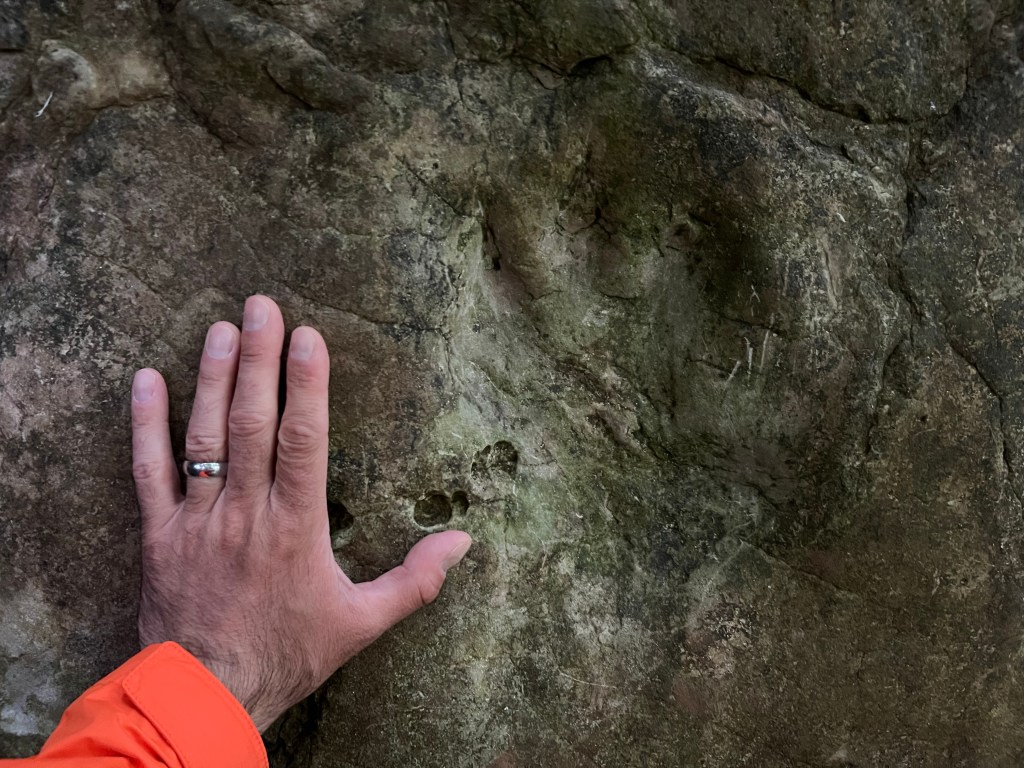 Halfway to the cliffs there was an Arran Geopark marker. Intrigued, we followed a short trail to the cliff, where there were fossilized footprints from the age of the dinosaurs. They do not have a firm ID, but they believe they were from a large alligator-like reptile.