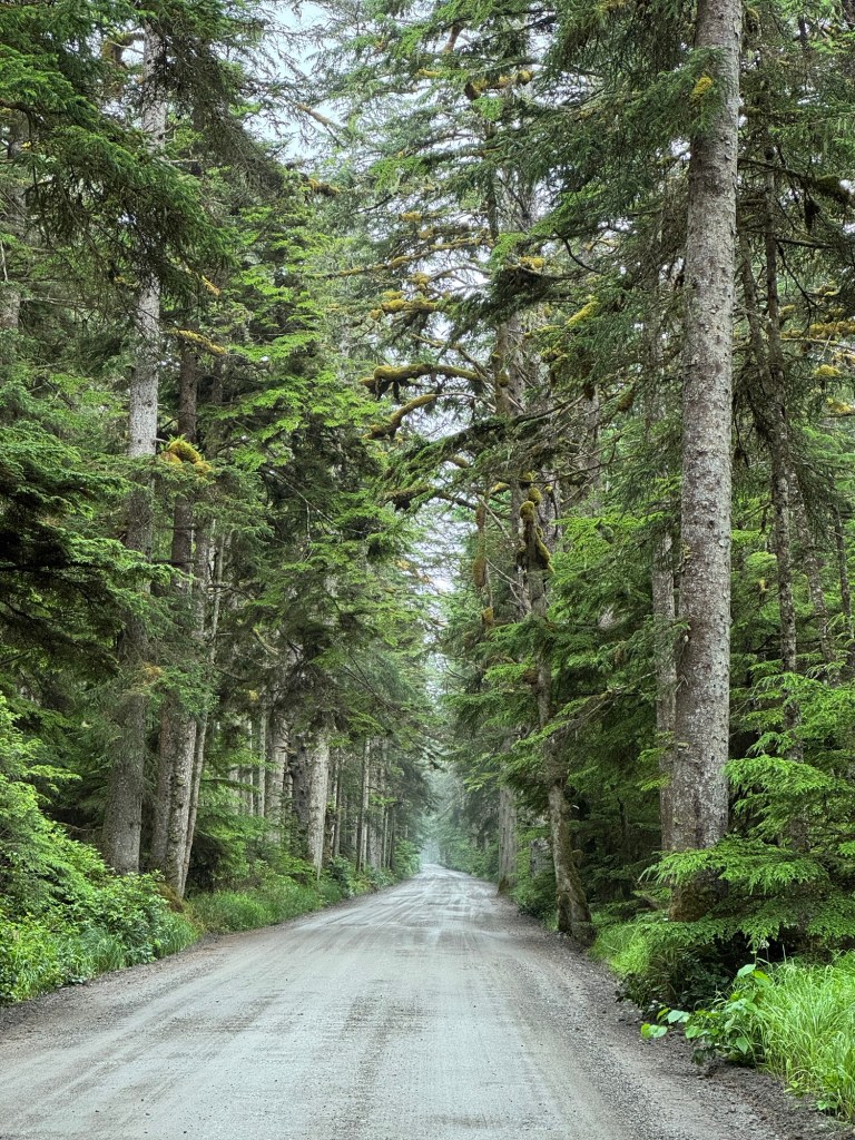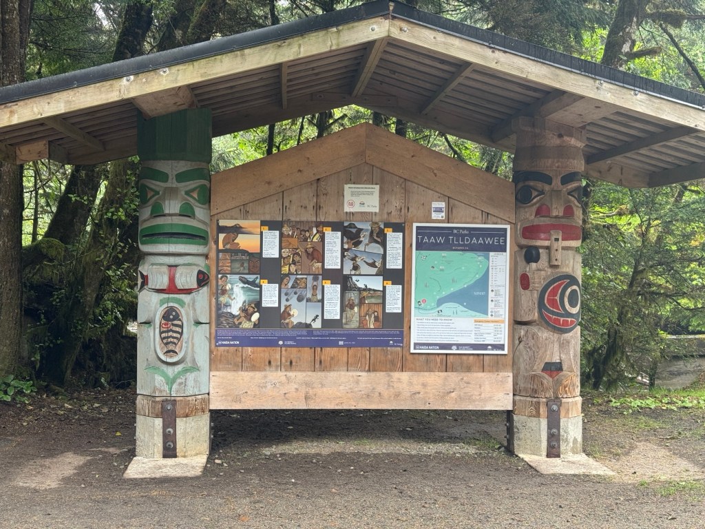 The thing that struck us is how alive and present the Haida culture is, despite the obvious and terrible impacts of colonialism. Poles are considered living members of their community, and are present at community buildings, institutions, and at private homes alike. Many buildings are longhouses or are constructed to reference these iconic structures. Art is everywhere, and the language is on street signs and throughout the area.
