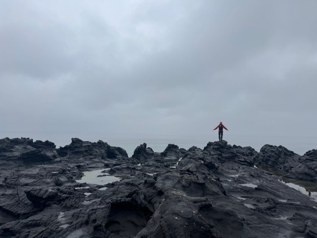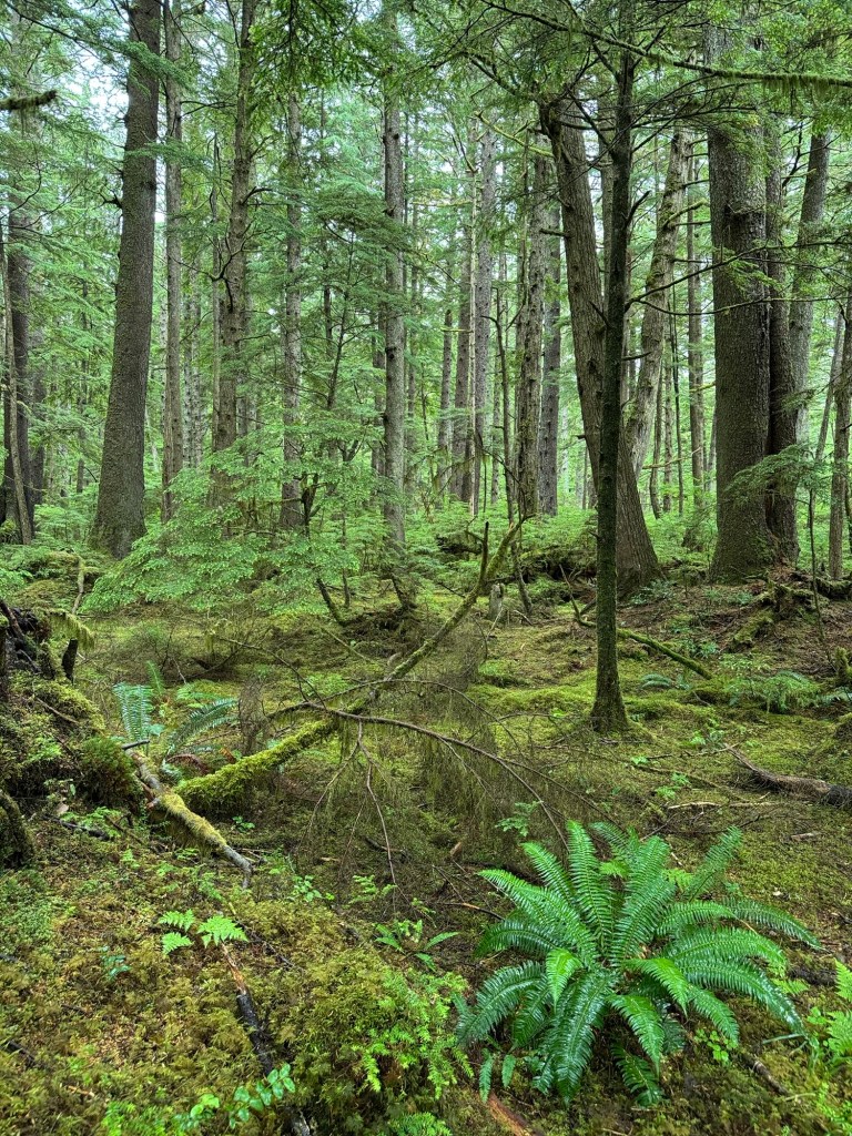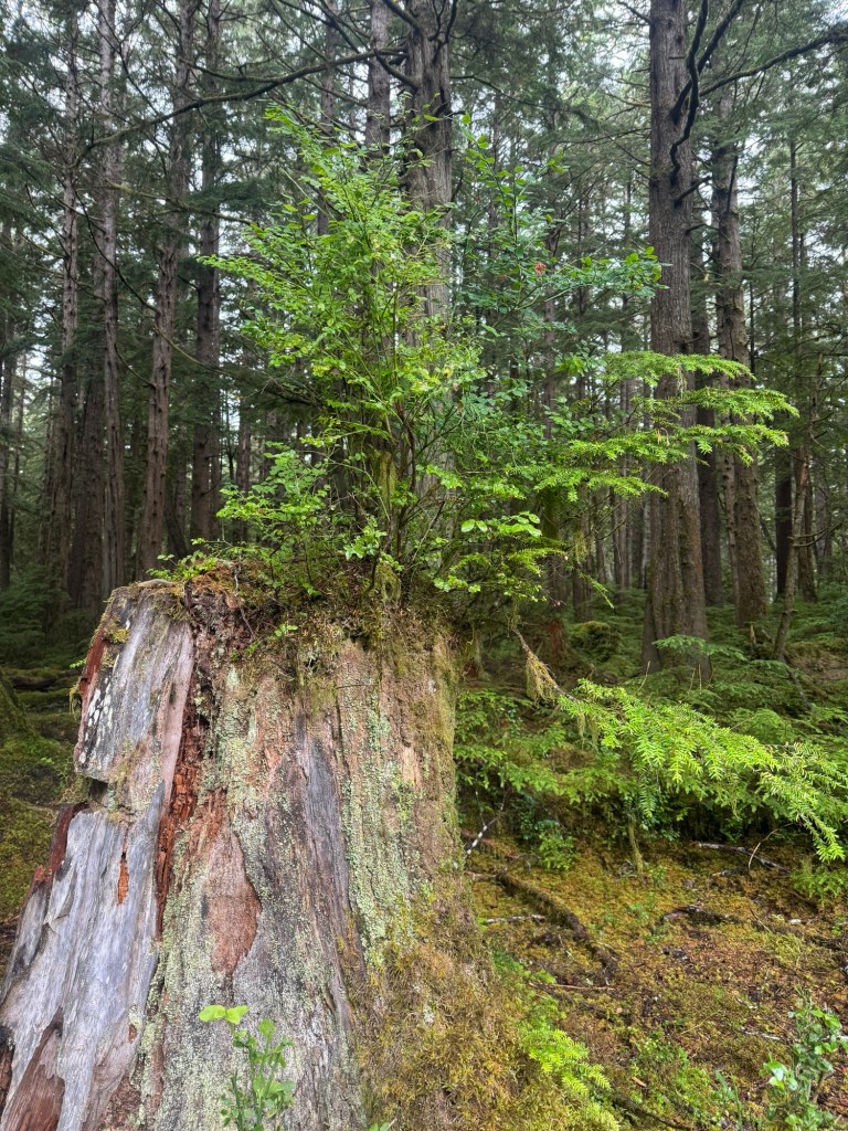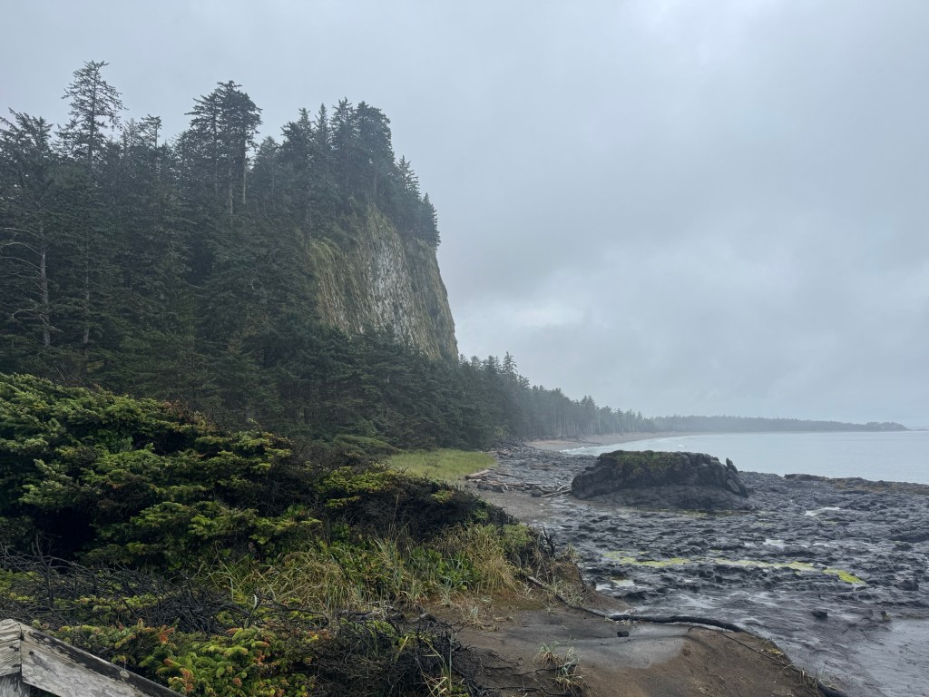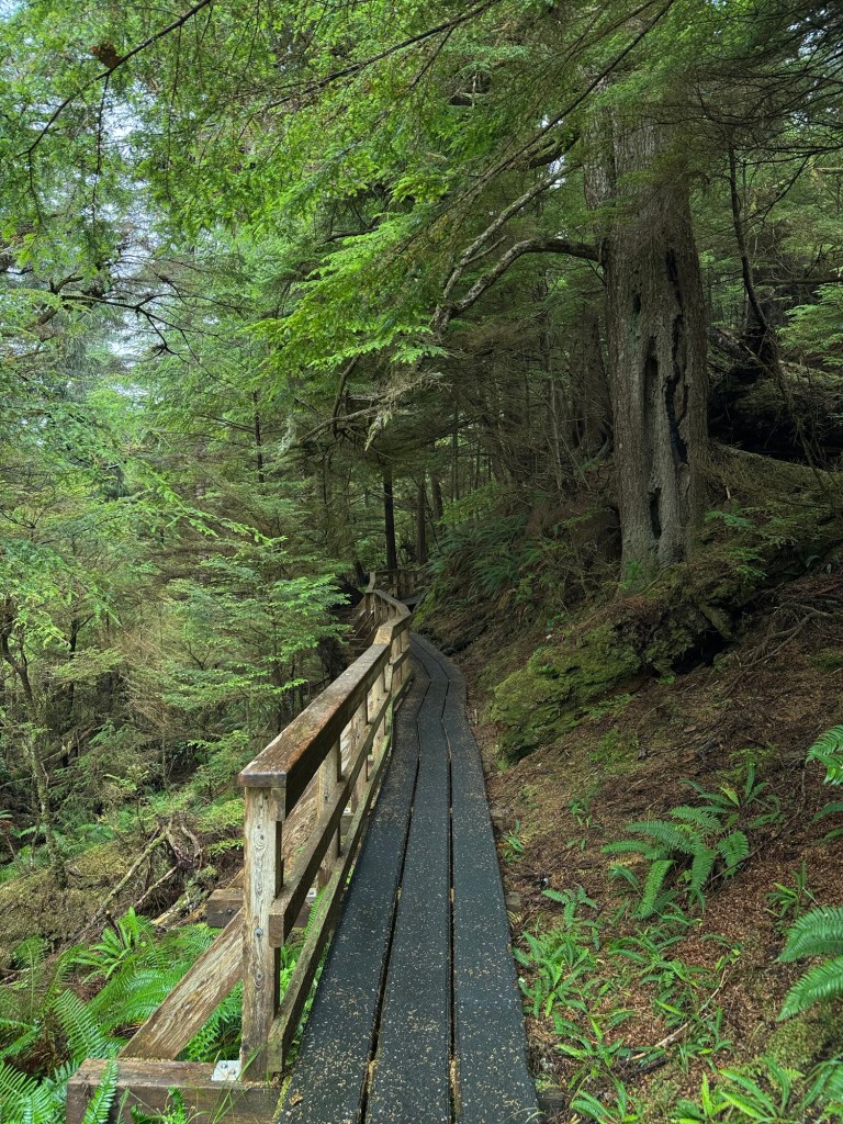 Next, we explored the boardwalk along Taaw Tlldaawee itself, through verdant forest to rocky outcrop. A blowhole adds drama and cultural importance to this spot. Jen then took the boardwalk back to the car while Dave summited the unique rock formation, formed by a volcanic cinder cone’s columnar basalt standing up to the weathering of the last ice age on the ocean side, while the hill was carved away.