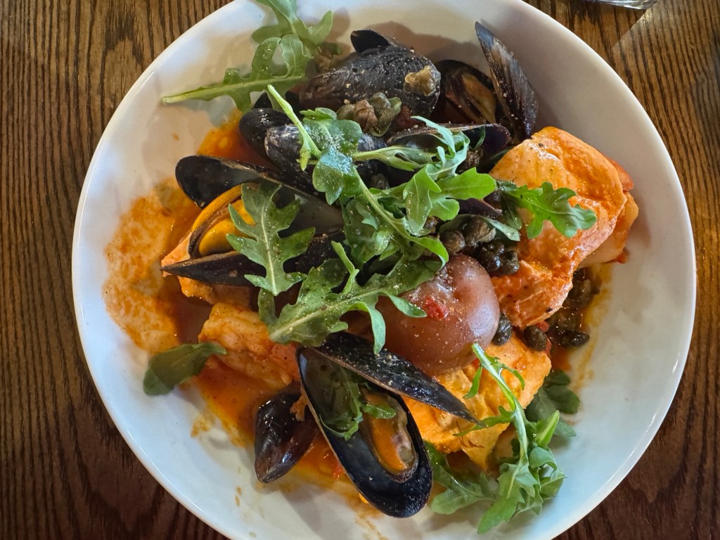 Dinner was also a swanky affair at what’s apparently the hottest restaurant in town, Blacktail. A line had already formed when we arrived at quarter to the opening hour, and not everyone in line at opening got a table (with many having to sit outside or face long waits). We enjoyed a house-made grilled sourdough with ricotta cheese, hot honey and pistachios to start. Dave has pasta bolognese, and Jen the fisherman’s stew. So delicious.