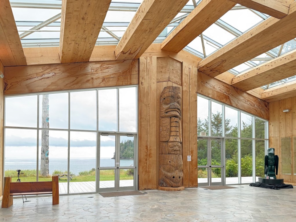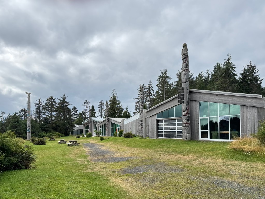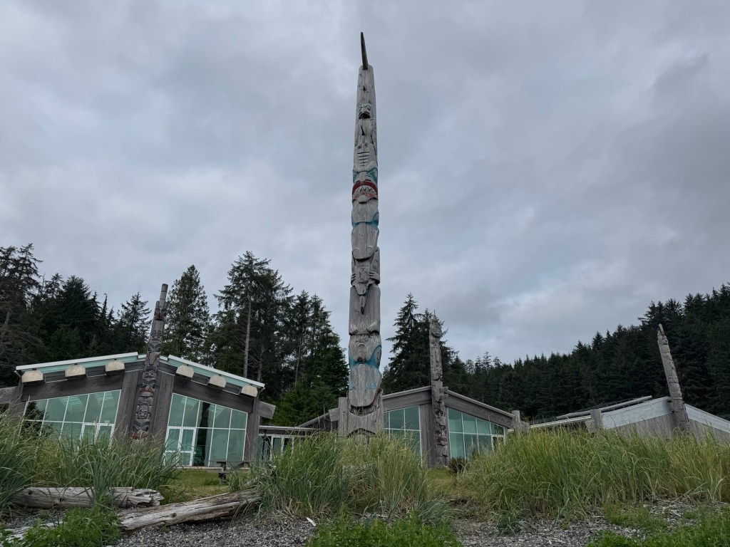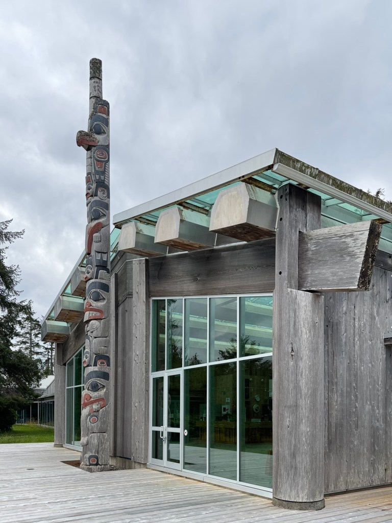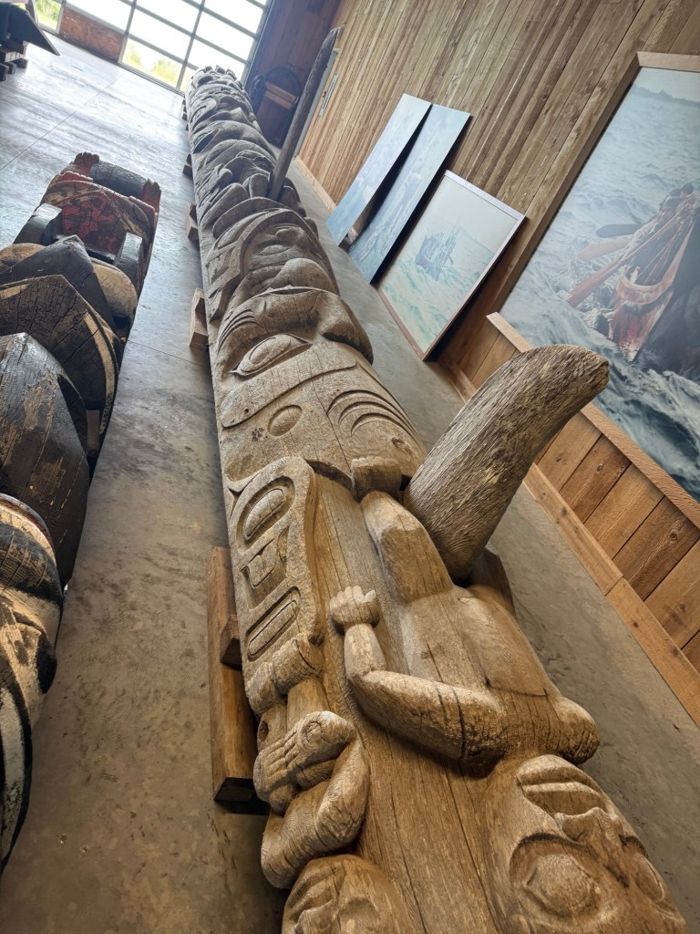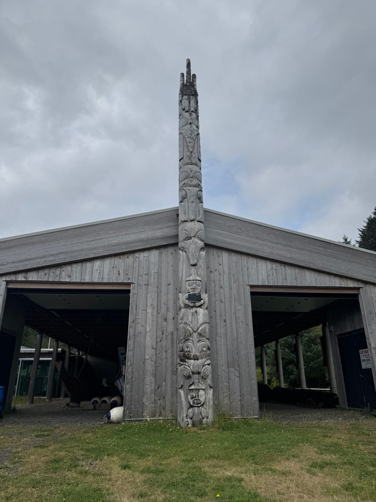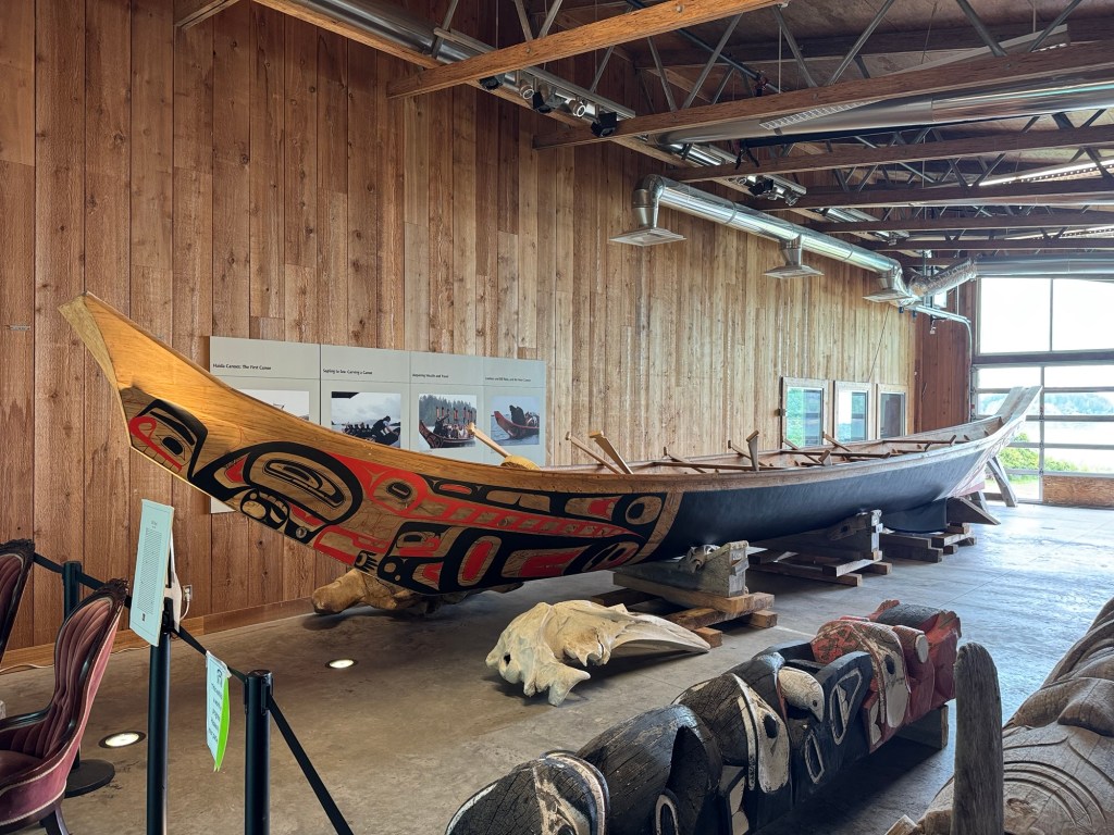 This morning we visited the Haida Heritage Centre, a wonderful museum and place of learning about Haida history, colonial impacts, and present day culture. Most of the museum did not allow photos, but highlights included the weaving of aay aay, a collection of argillite carvings (a rare stone found in Haida Gwaii that is reserved for Haida artist use), and of course lootaas, a fifty foot war canoe carved by Bill Reid (pictured).