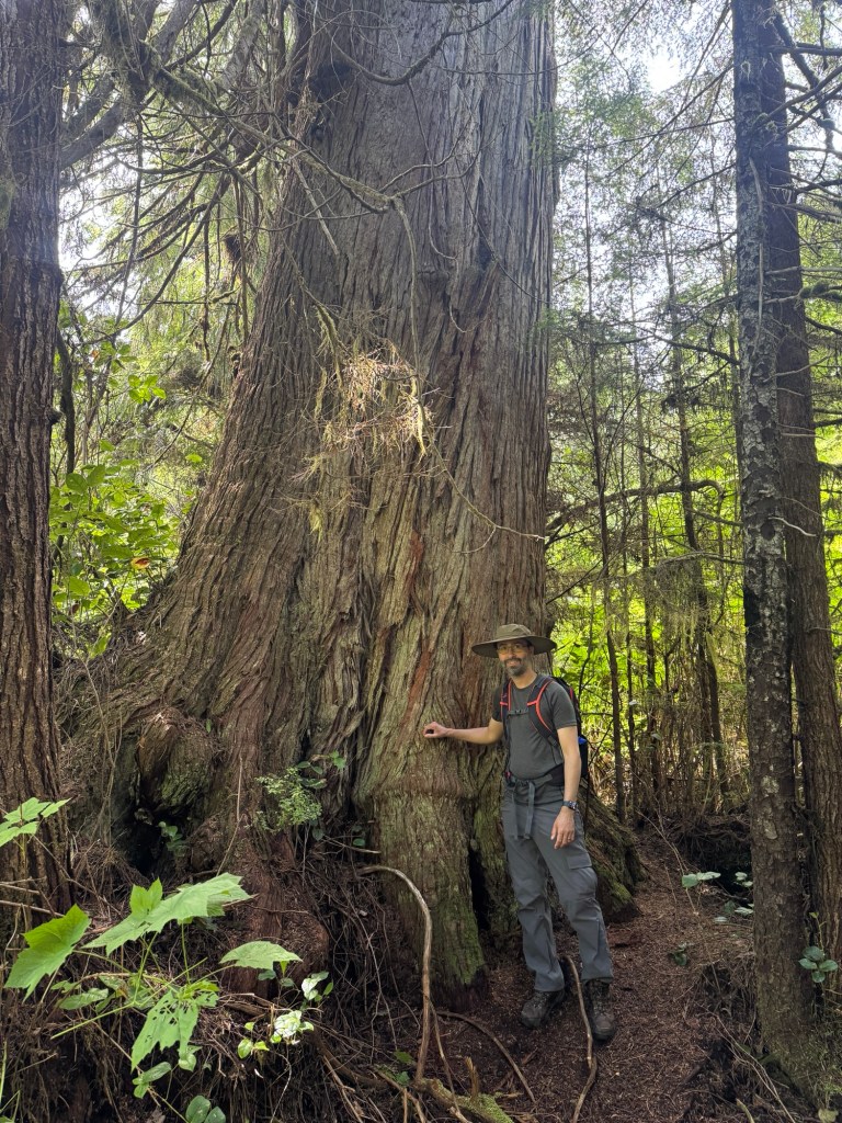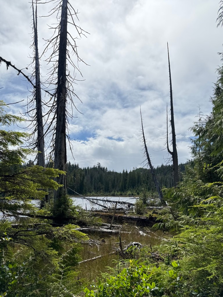 After our picnic we went to the Guuhlga Siiwaay K’iiwaay (Spirit Lake Trail). An interpretive trail in Skidegate, it starts in second generation forest but climbs to a beautiful lake surrounded by old growth forest, including some giant Western Red Cedars. What a beautiful and informative walk.