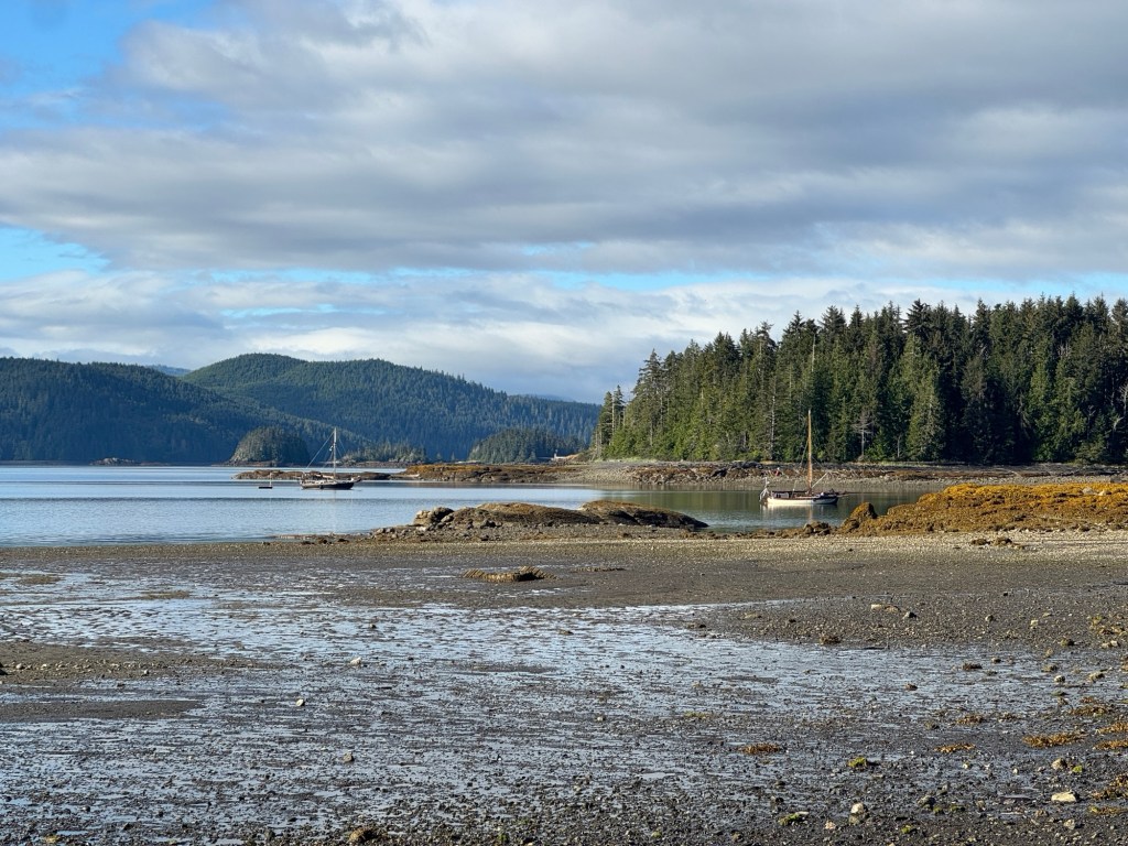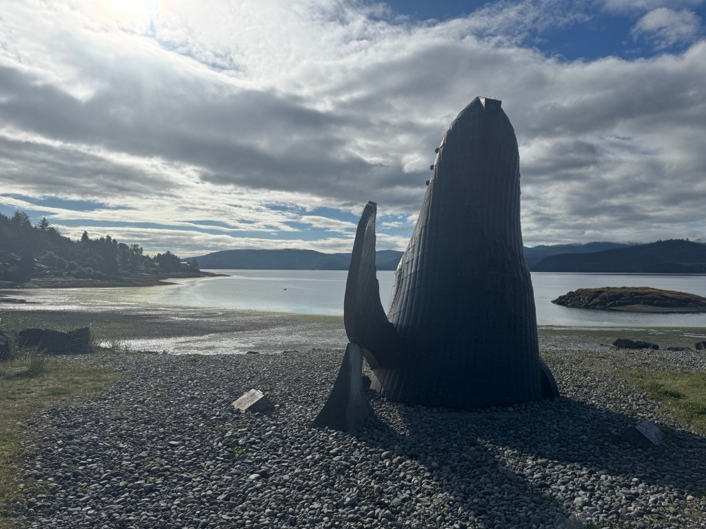 Jen started by walking into the village, and doing some low-tide beachcombing. Next was to check if the coffeeshop was selling sourdough today – it wasn’t, but she got a decaf latte and took it to the gardens by the wharf, where she watched eagles, ravens, barn swallows, crows, and a cedar waxwing. A visit to the visitor centre to browse came next, then a trip to the grocery store and a wander back to our abode.