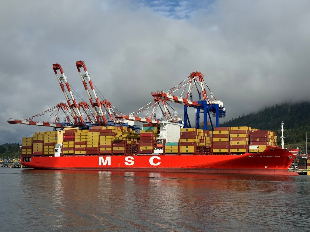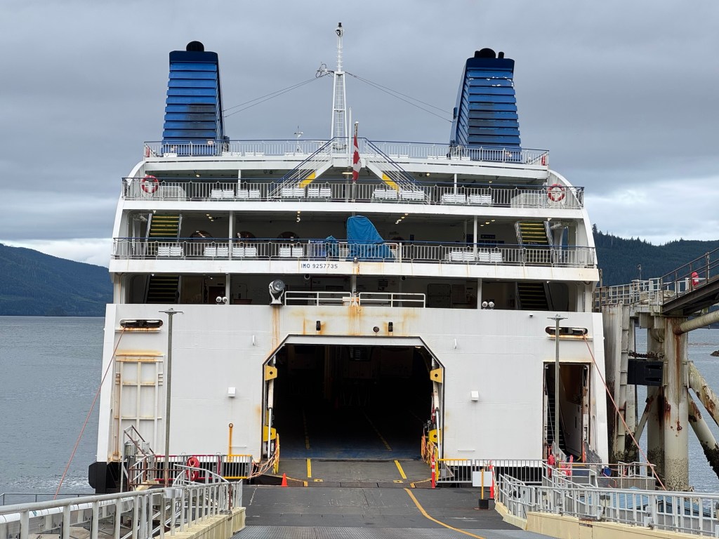 After a day of games, study (on Dave’s part), and watching downloaded videos, the islands outside of Prince Rupert came to view. We sailed past the container port and tugboats, and then we were returning to the vehicle deck.